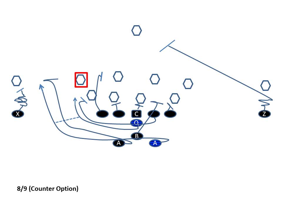 The counter-option play is a great way to counteract a defense when they start to fast flow their backside linebackers towards the point of attack in an effort to thwart our bread and butter play: Triple Option. It is their hope that they will outnumber the offense to the play side. Once a defense starts to fast flow their backside linebackers, it is time to make them pay by using this great counter-option play (shown below). It starts out looking exactly like Triple. The Backers start to flow to the perceived play side….then, it is time for the surprise!